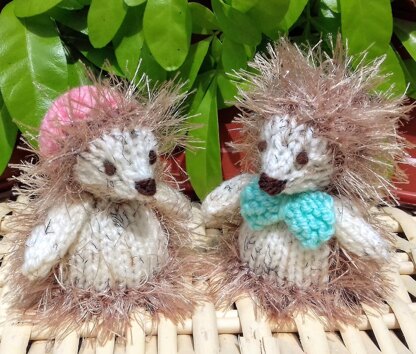 All you need are straight needles and leftover oddments of DK yarn and eyelash yarn. Bonnet, prickly head and face are knitted in a single piece, as is the body, with paws and bow tie added after.