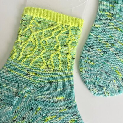 The series is designed to use a skein + mini “sock set” in ways that are more creative than just contrasting heels/toes. These socks are inspired by lightning!