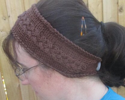 This headband uses fingering weight yarn held doubled to produce a warm fabric to keep the ears warm alone or worn under a hat on a very cold day. The band is worked flat and fastens at the back with a button.