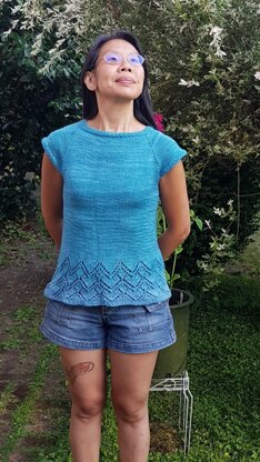 Helen Joyce Top has a lace hem and has a flattering positive ease. This is knit top down, completely in the round and you will only have 2 ends to weave in when you are done. This pattern is suitable for bamboo for summer and wool for winter.