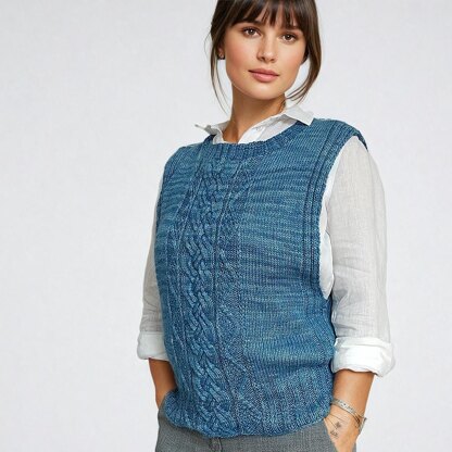 The back is worked in stockinette stitch and some simple ribbings at the hem and around the armholes. At the center of the front you work a cable panel, which is described in a chart.