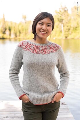 Helenium is worked in the round from the bottom up, beginning with a provisional cast-on. First the Sleeves are worked to the underarm then placed on stitch holders. Next the Body is worked to the underarm. Then the Sleeves are joined to the Body and the Yoke is worked. After the sweater is complete, the live stitches of the cuff and hem are finished with an attached i-cord.