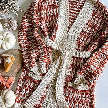 The Hello Pumpkin Cardigan is a beautiful inset mosaic crochet pattern featuring pockets, a belt and a ribbed collar. Inset mosaic crochet is a no-tail crochet technique that is used to create intricate colourwork patterns without the hassle of tails to weave in. The crochet pattern includes sizing from XS-5X with a Youtube tutorial.
