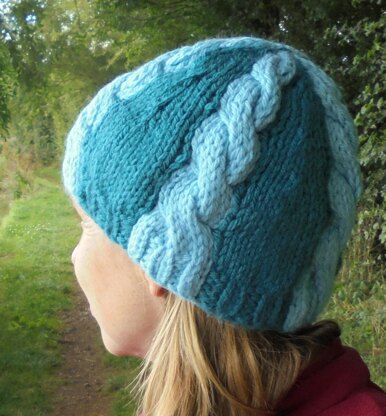 This hat is knitted from brim to crown, with five cable sections and five background sections. The two yarns are twisted around each other at the back of the work and the resulting ‘floats’ make for a warm and snug hat.