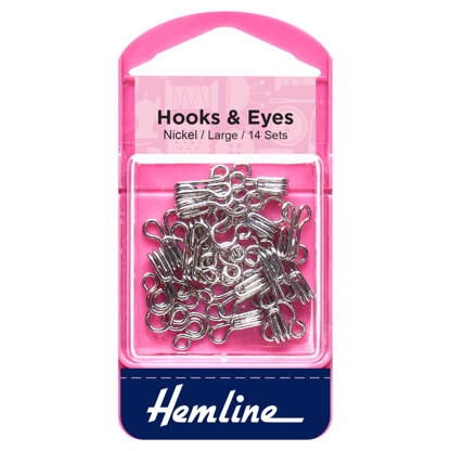 Rostfreie, vernickelte beschichtete Haken und Ösen aus Messing. Verdeckter, flach anliegender Verschluss, der häufig bei Kleidungsstücken verwendet wird, um einen festen Verschluss zu gewährleisten. 14 Sets in einer wiederverwendbaren Kunststoffbox. Größe 3.