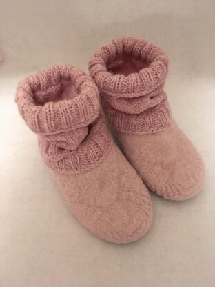 The slippers are knitted in the round as well as straight knitting and uses 100% wool worsted weight yarn as well as worsted weight wool ease or superwash yarn, basic knit stitches, 24” or 29” as well as 19.5" circular needles, size 6 double pointed needles. Skill level, moderate, short row knitting involved. Machine washing for felting technique.