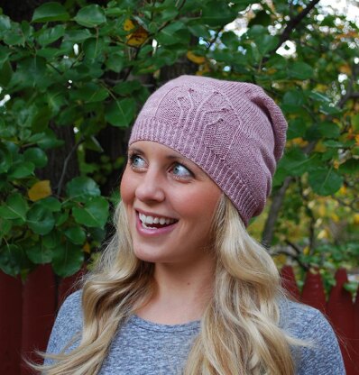 This lightweight hat is perfect for transitional times of year and even for chilly summer mornings and evenings. A delicate inset panel features traveling twisted stitches and small bobbles. The slouchy fit is flattering and easy to wear.