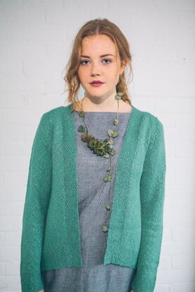 Longer length cardigan with short row shaping to create shaped hem. Integral double moss stitch edges.