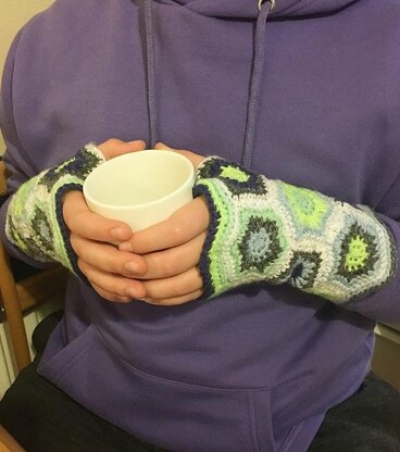 Crochet a beautiful and warm pair of Granny Hexagon Fingerless Gloves, a simple and fun pattern to make. This has been designed for stash-busting, using Double Knit Acrylic Yarn. Pattern includes written instructions and reference photos.