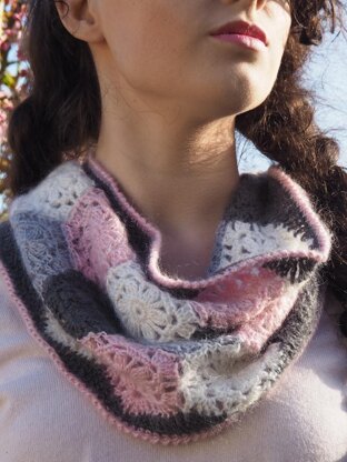 This cowl is made up of flower hexagon motifs, joined using the join-as-you-go method which is explained in the pattern. Using 4 colours and a lovely soft, light yarn it is warm and comfortable to wear. A luxury addition to any outfit!