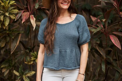 A softly ruffled peplum and sleeves add a feminine touch to this boxy cropped summer tee that pairs effortlessly with skinny jeans or wide leg pants. The top down, seamless raglan construction makes this an enjoyable knit with simple details that add intrigue.