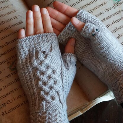 The phrase “Hic Sunt Dracones” – “Here be dragons” dates back to a couple of early 16th century globes, which depicted dragons and sea monsters in uncharted areas. The mitt design was inspired by medieval illuminated manuscripts such as the Book of Kells. Small, dragon-like creatures hide in the knotwork of an otherwise classic cable design and add a little detail to the thumb.