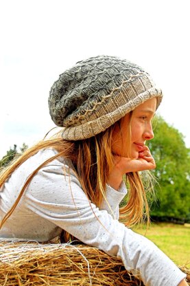 The simple slipped stitch textures of the rise of this hat tone down and enhance variegated yarn with an organic softness, whilst the crown transitions to city-chic of an architectural beauty. My sample is a slouchy version. Can also be made as a beanie.