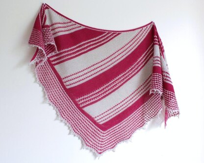 High Altitude is knit in two colours to accentuate the unique features of the mesh stitch pattern used in both designs. For the shawl’s body, you start with a provisional cast-on that will become the bottom edge of the right wing of the shawl, then you knit on the bias, reducing the stitch count with simultaneous decreases and increases at both edges of the knitted fabric, and finally, finish at the tip of the shawl’s left wing. The finishing touch is made by knitting on a mesh border with a picot bind-off edge. All-over garter stitch and ridged ribbon stitch make this an easy and relaxing knit, and the elements of colorwork and modular knitting make this project fun.