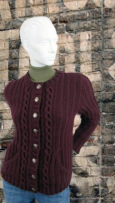 This is the pefect cardigan for chilly fall days, whether you're running errands or just hiking in your favorite outdoor spot. Cables are worked up each side of the front and centered on each sleeve. The rest of the body and sleeves are worked in seeded rib to create a wonderfully three dimensional textured fabric.