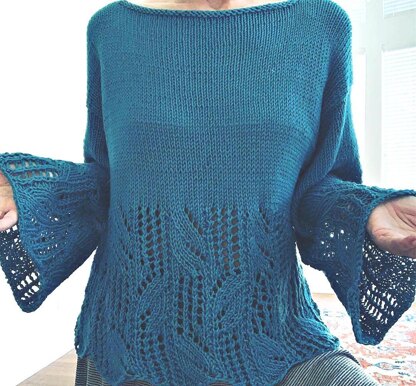 This is such a comfy sweater to knit and wear. It has a boat neckline, is oversized, knitted all in one piece with beautiful lace borders around the bottom edges of the body and sleeves.