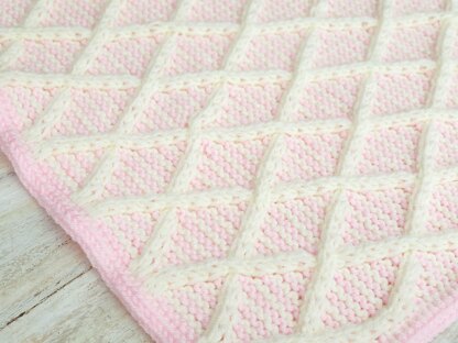 Wrap up or cover your precious bundle with this beautiful chunky knit baby blanket. Easy to work cables on a two coloured garter stitch background have a real wow factor. Only one colour is used in each row, this blanket works up quickly and is easy and fun to knit. Choose your own colour combination! The blanket also is reversible, with a lovely diamond pattern on the reverse side. The pretty applied I-cord edging gives it a very polished touch. Thick and squishy, Hinter Gitter Blanket makes a great afghan for any loved one, if you want to make it in a different size, which is easy to do. Size: approx. 30 by 35 " or 76 by 89 cm, but can be made bigger or smaller by adjusting pattern repeats.