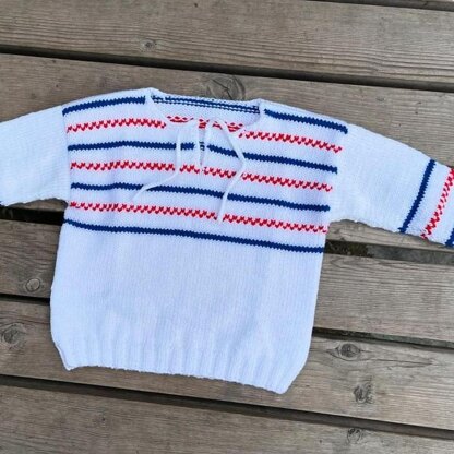 HippHopp is a cozy sweater worked bottom to top in the round using Stockinette stitches. Halfways you will work stripes in red and blue. The sweater has a split at the Front piece where you will crochet an edge and make straps. My inspiration is a Swedish model, that I have made several of, called Pippi sweater. Pippi is a little wild girl from childrens books, written by the Swedish author Astrid Lindgren. In english she is known as Pippi Longstocking:)