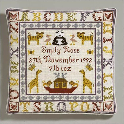 Ein Gobelin Set mit bedrucktem Zweigart Stramin 4,5 Stiche/cm (12 count), in farbig gedruckter Vorlage, Nadel und Anchor Gobelinwolle. Ein Gobelin mit der Arche Noah und einigen ihrer Tiere. Perfekt, um die Ankunft eines Neugeborenen zu feiern. Mit einer Fülle an entzückenden Motiven und Buchstaben. Endmaße des Gobelins: 35 x 35 cm