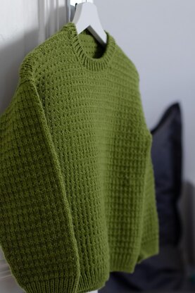 The pullover is knitted top down in one piece without seams. First, the back is knitted flat using German Short Rows technique to shape the inclination of the shoulders. The shoulder pieces are also knitted flat one after the other, while at the same time shaping the neckline. After that, both shoulder parts are joined together and knitted in one piece for the front. Next, the back and front are joined together and knitted straight in round for the lower body area. It is finished with a cuff in 1x1 ribbing pattern.