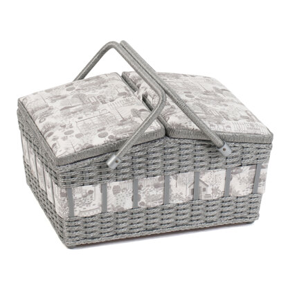 Ein großer geflochtener Nähkorb mit zweiteiligem Deckel. Der mit Raphiabast umwickelte Griff und die geflochtenen Seitenbesätze setzen Akzente. Einsatz aus Hartplastik mit Abteilen für Nähzubehör. Tasche und Nadelkissen innen am Deckel. Nur Fleckenreinigung.\n
