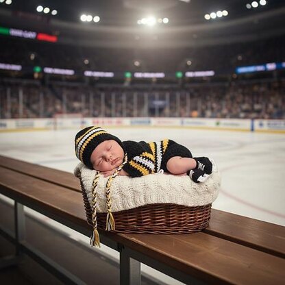 This super cute little Boston Bruins Baby outfit is the perfect little set for any Newborn baby pictures for the sports lover. Easy to do with simple instructions. Also cute if you have or purchase the Bruins logo to go on the front of it. Pattern includes the instructions for everything in the pictures, hat, pants, jersey and hockey pads. Pattern is written in US terminology. Size Newborn.