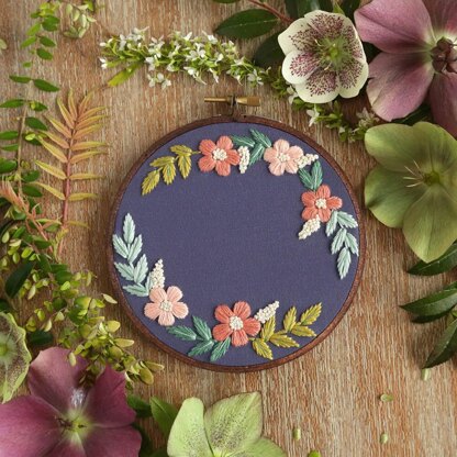Beginner embroidery kit containing everything needed to learn how to embroider.Digitally printed cotton fabric, an unfinished wooden embroidery hoop, DMC embroidery needle size 5, instruction booklet, and full skeins of DMC embroidery floss.