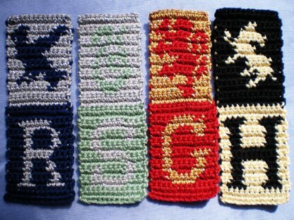This pattern contains four bookmarks, one bookmark representing each house with the house initial and animal symbol.
