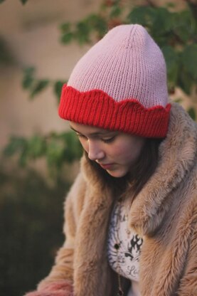 A simple ribbed beanie with a wavy scallop folded brim. Fold it high for a classic look or low for a longer pointed style. Flip it inside out to reveal a new crown texture with chained lines or crew ridges. Worked in two tones, it’s the perfect way to use up leftover yarns or lonely balls, creating a unique, color-rich accessory.