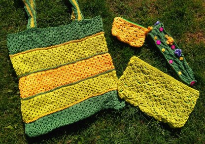 Knitting pattern for a holiday travel collection. Pattern includes instructions for a beach bag, washbag, coin purse and headband.
