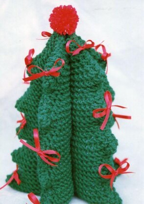 This easy knit version is similar to an old cloth version that was made many years ago. We transformed the cloth version into knit, and made it easy to put together too! Finished tree is about 10 inches tall. Has an almost 3-D effect. Add some satin ribbon bows, and a pompom for top and you are done. You could use tiny ornaments instead of bows if desired. The tree is knit in 5 easy sides, and then follow the fast directions to complete! This is so cute for Holiday decorating! Make an extra one for your friends desk at the office! Uses worsted weight yarns, knitting needles, US # 10. You will also need a bit of pillow or toy stuffing.