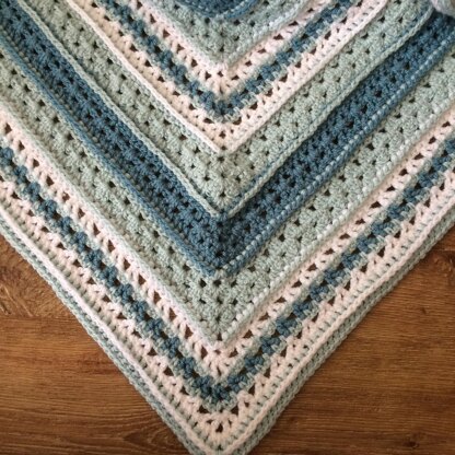 Shades of sea and sky with splashes of white reflecting the wave tops and wispy clouds in the big sky, this shawl celebrates Holkham Bay, home to one of the most beautiful beaches in England.