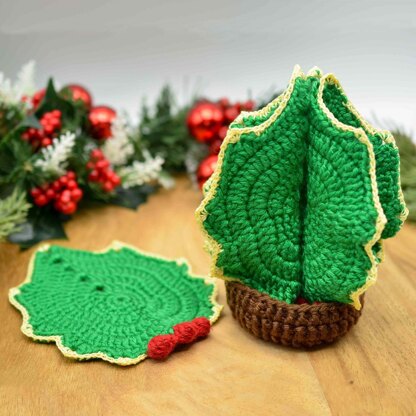 Holly plants and Christmas trees are holiday classics. Crocheting a few holly leaves, with their small berries, as festive coasters will bring holiday cheer to your table.When placing them straight up, the set looks like an illuminated Christmas tree.