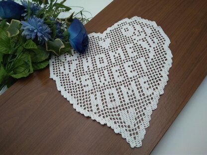 Pattern crochet doily HOME SWEET HOME heart filet, PATTERN 415. Need: I have used simple crochet thread n. 8, size steel crochet hook n. 9 (1,15 mm), you need 35 gr. Measure at the end: height 13.38”inch (34 cm), width 12.20”inch (31cm). Thanks!!!!