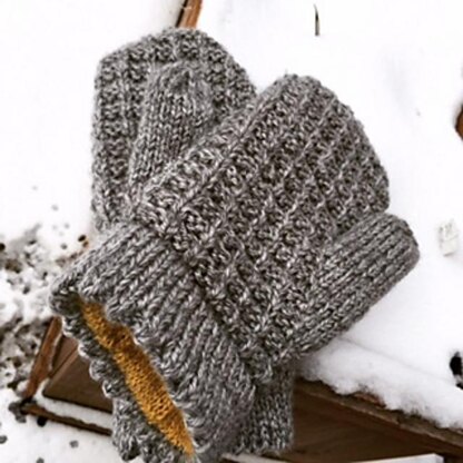 The outer mitten is knitted with worsted weight yarn. It uses a provisional cast on and has a pico turn over cuff. The mitten body is knitted with a waffle stitch pattern. It is then lined with a Sport weight yarn by picking up stitches from inside the outer mitten’s cuff and knitting the lining. It makes for a super warm mitten and extra soft on the inside.