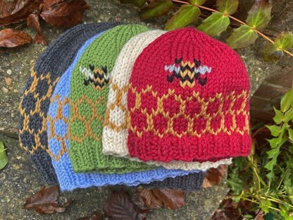 These Honeycomb and Bee themed hats have a ribbed brim and a stocking stitch body with a Fair Isle/stranded colourwork honeycomb repeat pattern encircling the lower section of the hat body. The motifs are worked using only two colours in a row which makes this an ideal pattern for those new to the Fair Isle technique. The bee(s) are added by Swiss Darning/duplicate stitching them on to the finished hat. The hats pictured are worked using a lovely soft pure wool yarn in worsted weight on 4.5mm/US 7 needles and can be topped with an optional pompom; you will need more yarn if making your own pompom.