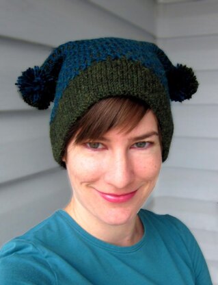 Honeycomb Hive Hat is a close fitting hat with little ‘ears’ that are decorated with pom poms. A double layer band and 2-color honeycomb stitch pattern create dense fabrics that will keep your head nice and toasty warm. The hat is worked from the bottom up in the round. With no shaping and an intuitive stitch pattern, this hat is a relatively easy knit. The top of the hat is finished with a three needle bind off.