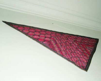 The shawl is an interesting construction as it consists of two back-to-back mitred triangles. The honeycomb design is reflected at centre back and in the centre of each triangle. Because the mitred triangles make the ridges of knitting run in various directions the shawl looks different from every angle. Sometimes you only see stripes; sometimes you see a mixture of stripes and honeycomb; occasionally you see all honeycomb.