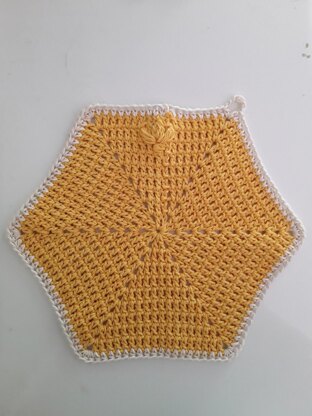 This is a fun and fast, advanced beginner to intermediate pattern. You will need 2 different color yarns. The yarn I used is Cestari - Old Dominion Collection of 100% virginia cotton, 3 ply DK weight with 100gm-250 yds per skein. I chose 1 skein of color Sunflower and 1 skein of color Cottonfield White. Approximately 100 to 150 yds were used. Tools needed: G6/4mm hook, sizzers, blunt tapestry needle for weaving in ends and a stitch marker to hold your place when taking a break. My finished size was 9 inches in diameter. I used this pattern to make a trivet for my kitchen. You’ll see in the photo I added a 5ch loop in the last corner to be able to hang on a hook. This hexagon is versatile. Blankets, coasters, washcloths, placemats are just a few ideas. Enjoy.