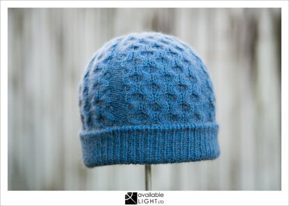 The basic honeycomb cable is used here to form 3 different patterns around the hat. Possum blend merino yarn which gives a slight halo and extra warmth was used for the sample, but you can use any wool or merino blend yarn (bear in mind that the characteristics & drape of the fabric may change depending on your choice).