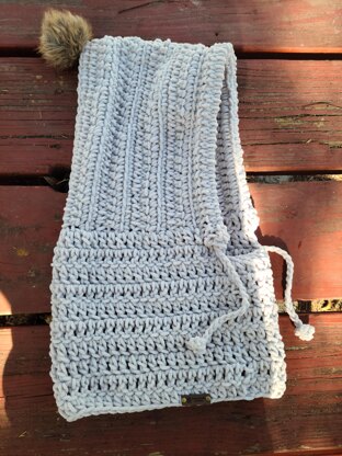 It is made with plush yarn. The hooded cowl is very warm and soft. The model is an adult size small female. The hood is made in one size however, I left notes where you can adjust sizing if needed. My sister absolutely loves these, I have made her 3 in various colors. It works up so quick. This one has a soft teddy bear feel. Very customizable with colors and textures.