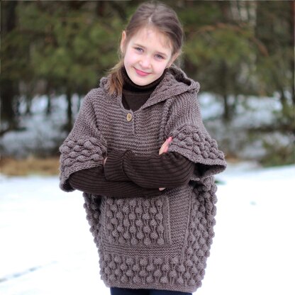 Raspberry poncho is knit from the bottom up. The poncho is designed with positive ease about 50-75 cm/ 20-30 inches. Back, front and pocket of poncho are knitted separately. After the shoulder seams are completed the stitches are picked up for hood.