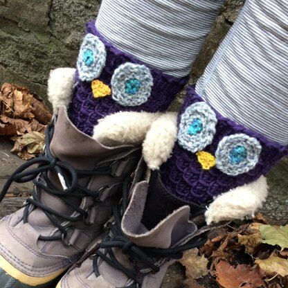 A whimsical way to spice up your outerwear. You can't help but smile when you've got owls peeking out of your boots! Made to match [Feathery Owl Hat][1] pattern.