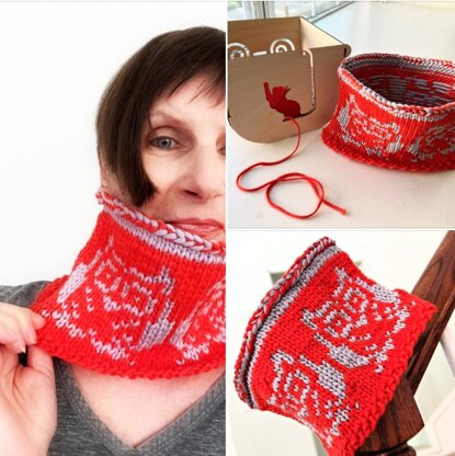 The Hoot cowl is just so adorable with cute owls all around, this puts a smile on your face. Knitted in the round, as shown here with the perfect yarn for it, a squishy soft tube filled with fluffy cotton. The cowl actually stands up nicely, to show off the pattern beautifully. Done with a simple stranded knitting method in two contrasting colors.