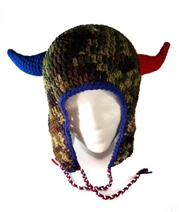 Finished hat measures approximately 22” circumference, 8” top of head to bottom (face edge), 12.5” top to bottom of earflap, 12.5” horn span.