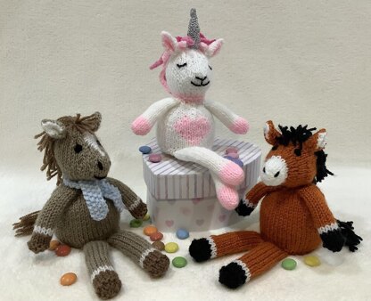 This knitting pattern is for 2 Horses and a Unicorn Chocolate Orange Covers. They have 3 different Heads and Mane styles that are interchangeable. They measure 14cm high excluding the Legs and the Horn. All three are made in DK yarns and the Unicorn needs Lincatex Gold Rush yarn in Silver for the Horn. You will also need toy stuffing and a Chocolate Orange or suitable size Bath Bomb.