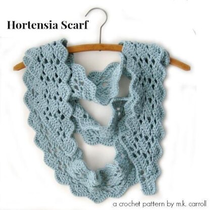 Simple stitches make a lace scarf that drapes on the bias. Instructions are given in both written and charted format, using US terminology (a version with UK terminology is in the works). The open lace sections are reminiscent of the 4-petaled Hortensia flowers, commonly called hydrangeas.