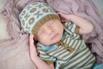 Keep baby covered head to toe in love by adding this matching cap to the Kiss Me Romper and Welcome Mocs to make a completely adorable set. • If you’re working this hat for a summer baby, consider working the XO Pattern just once to keep it ligher weight. • If this is your first stranded colorwork project, check out the tips on page 31 before you start your project. • Shown in Preemie.