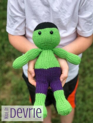 Hulk smash!!! I am not sure I know any boy who doesn't relate in some way to this stubborn, destructive and short tempered character. This adorable Hulk doll is a perfect toy for anyone that can enjoy this character. He is about 10 1/2 inches tall when she is done and only requires a small amount of worsted weight yarn. The pattern is written in the round and has wonderful photo tutorials. It is written line by line in U.S. Standard terms. Designed with as little sewing as possible.
