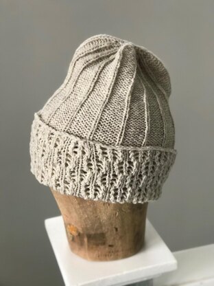 English The hat is worked in the round from the bottom up. Starting with the easy lace pattern. When the hat is finished you turn the work inside out. Pattern contains written instructions. One size. Gauge: 24 stitches and 34 rows = 10 cm/4" You need 1 ball of De Rerum Natura Ulysse.